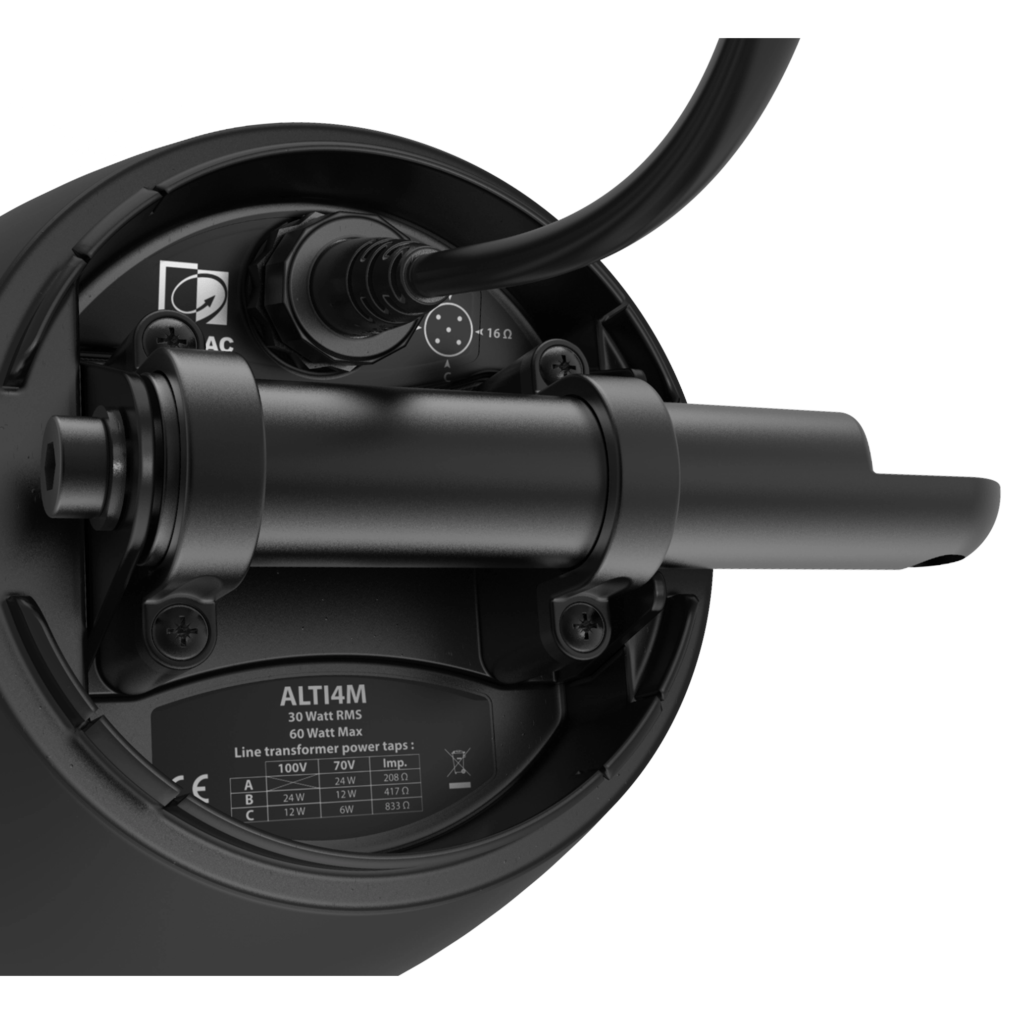 The ALTI4M is a variant of the ALTI pendant speakers, featuring a die-cast mounting bracket for wall & ceiling mount purposes. This allows the same audio system design and identity throughout the entire installation in case some areas are not allowing pendant solutions being used due to the ceiling heights or structures. Acoustics and construction are identically crafted, while connections are made through weatherproof AWX5™ connectors, this construction has an IP65 rating.