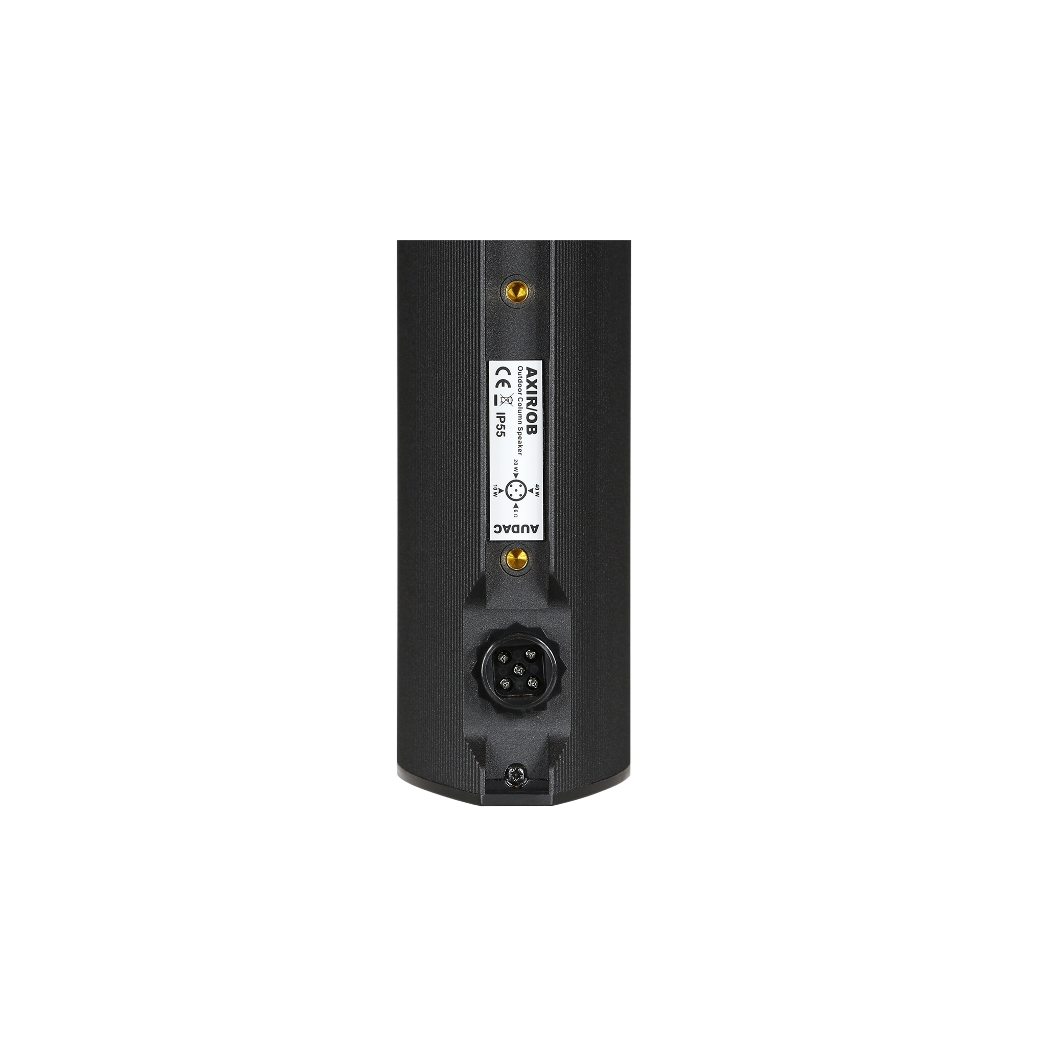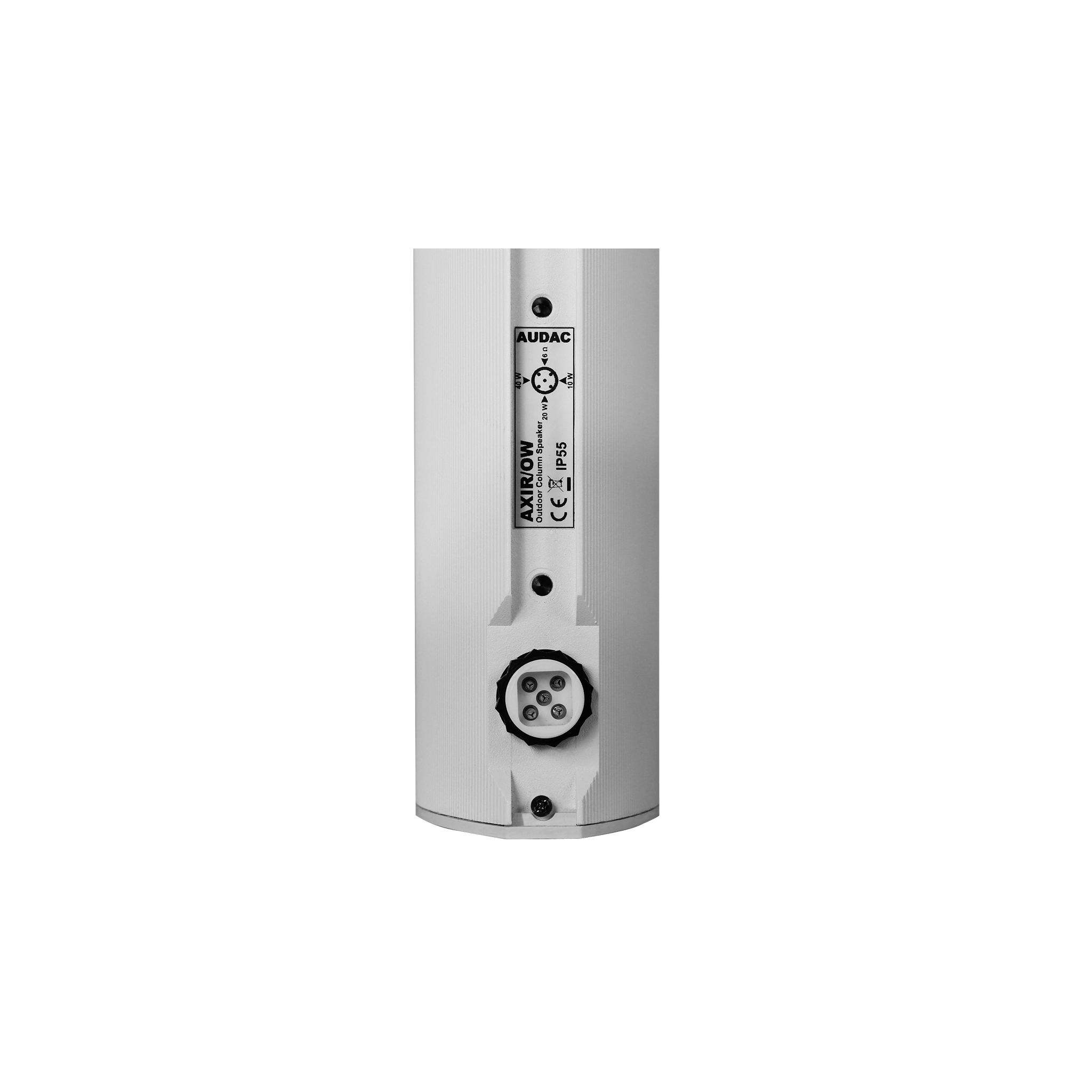 The AXIR/O is an outdoor column speaker with a power rating of 120 Watt which is especially designed for outdoor use lending itself to a wide variety of open-air applications where audibility of music and speech is important. It features two speaker sections, each of them consisting of six 2” high quality broadband loudspeakers providing an extraordinary sound and surprisingly high power. A 100 Volt multi-tapping line transformer allows the connection of the loudspeaker in large PA systems with a power rating selectable between 40 Watt, 20 Watt and 10 Watt. A fourth selection for connection in low impedance audio systems is provided too. To guarantee the optimal performance and long term reliability in outdoor circumstances, various specific features are provided. The connection of the loudspeaker is performed using a waterproof rotatable AWX-5 connector whereby the desired power tap can be selected depending on the rotation of the connector. Secondly, the 12 drivers receive a special coating to protect them from the elements while an acoustically transparent and water-repellent cloth in front of each driver keeps penetrating water at a safe distance. Further added reliability is achieved by using an aluminum front grill and an electroplated stainless steel mounting bracket. Together, these improvements result in a weatherproof IP55 column speaker of exceptional quality and design! The included mounting bracket allows the speaker to be focused into any direction to obtain the best possible audibility. Available in white (AXIR/OW) and black (AXIR/OB).
