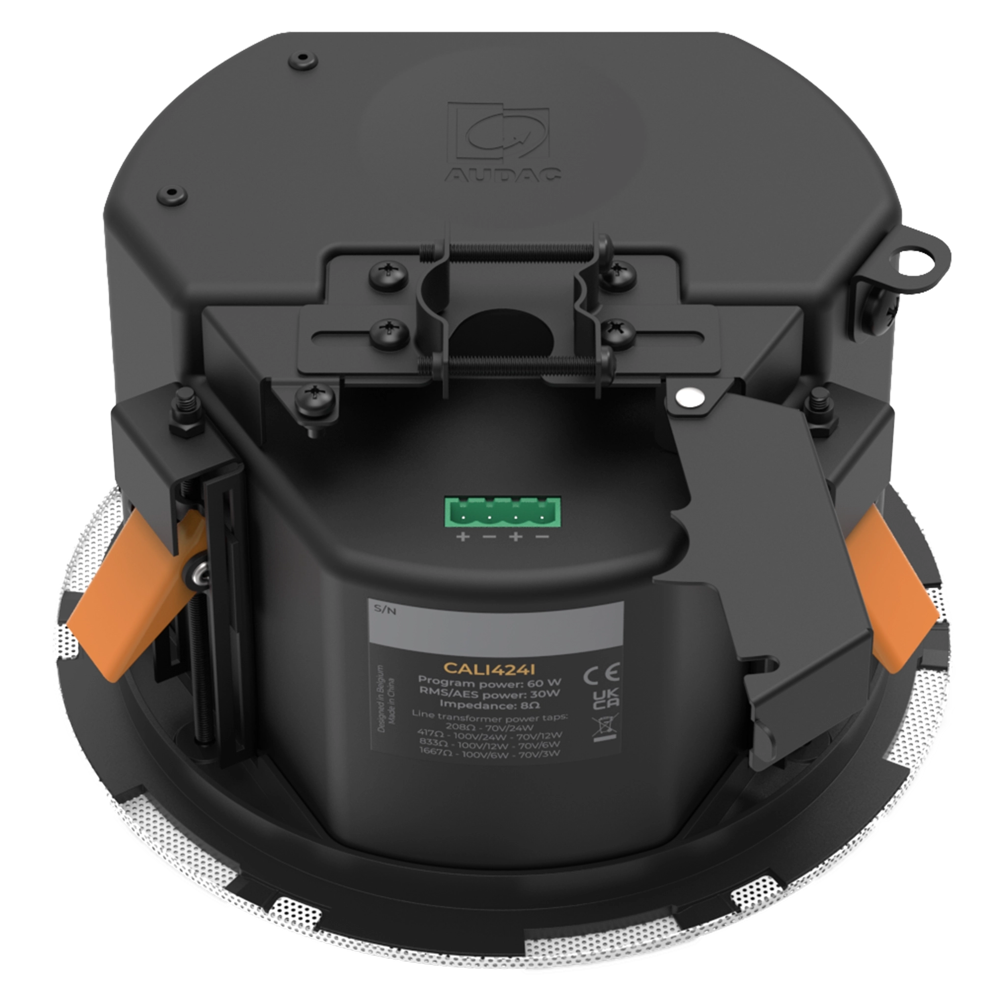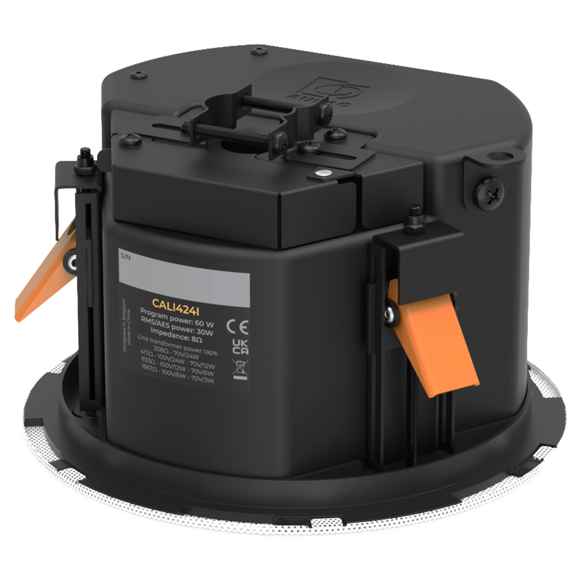 The CALI424 is a 2-way ceiling speaker with rear dome, constructed using a 4” cone driver, combined with an coaxially mounted 1” soft dome tweeter which is fitted with a phase plug for excellent off axis performance up to 155°.
