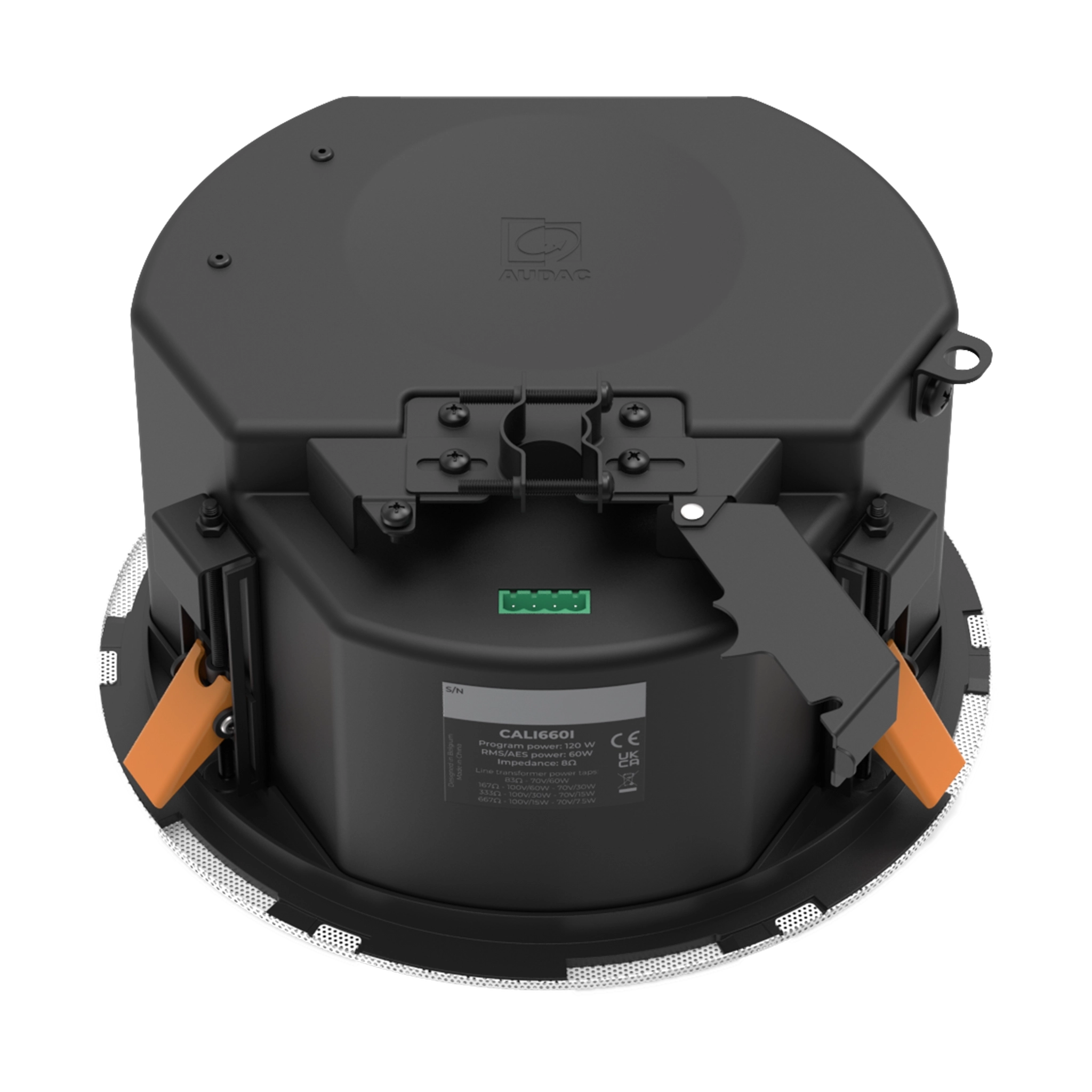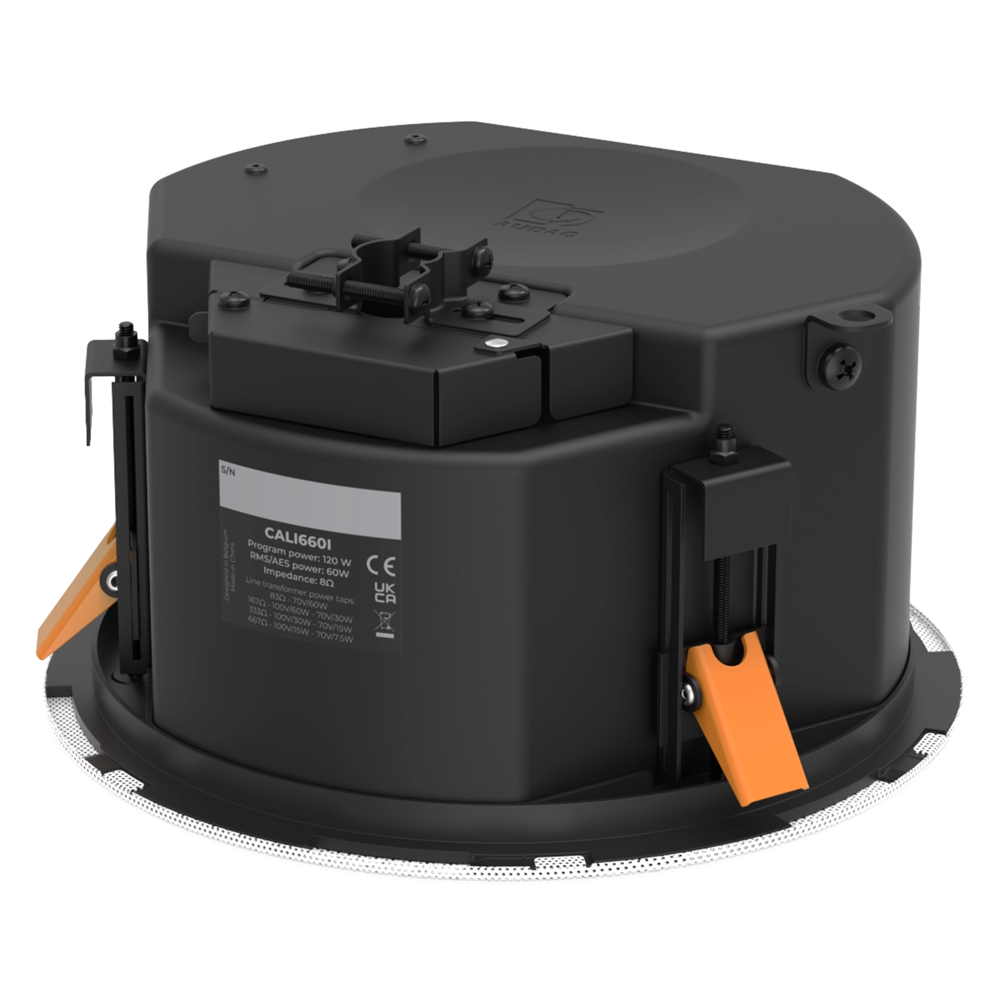 The CALI660 is a 2-way ceiling speaker with rear dome, constructed using a 6.5” cone driver, combined with an coaxially mounted 1” soft dome tweeter which is fitted with a phase plug for excellent off axis performance up to 145°.