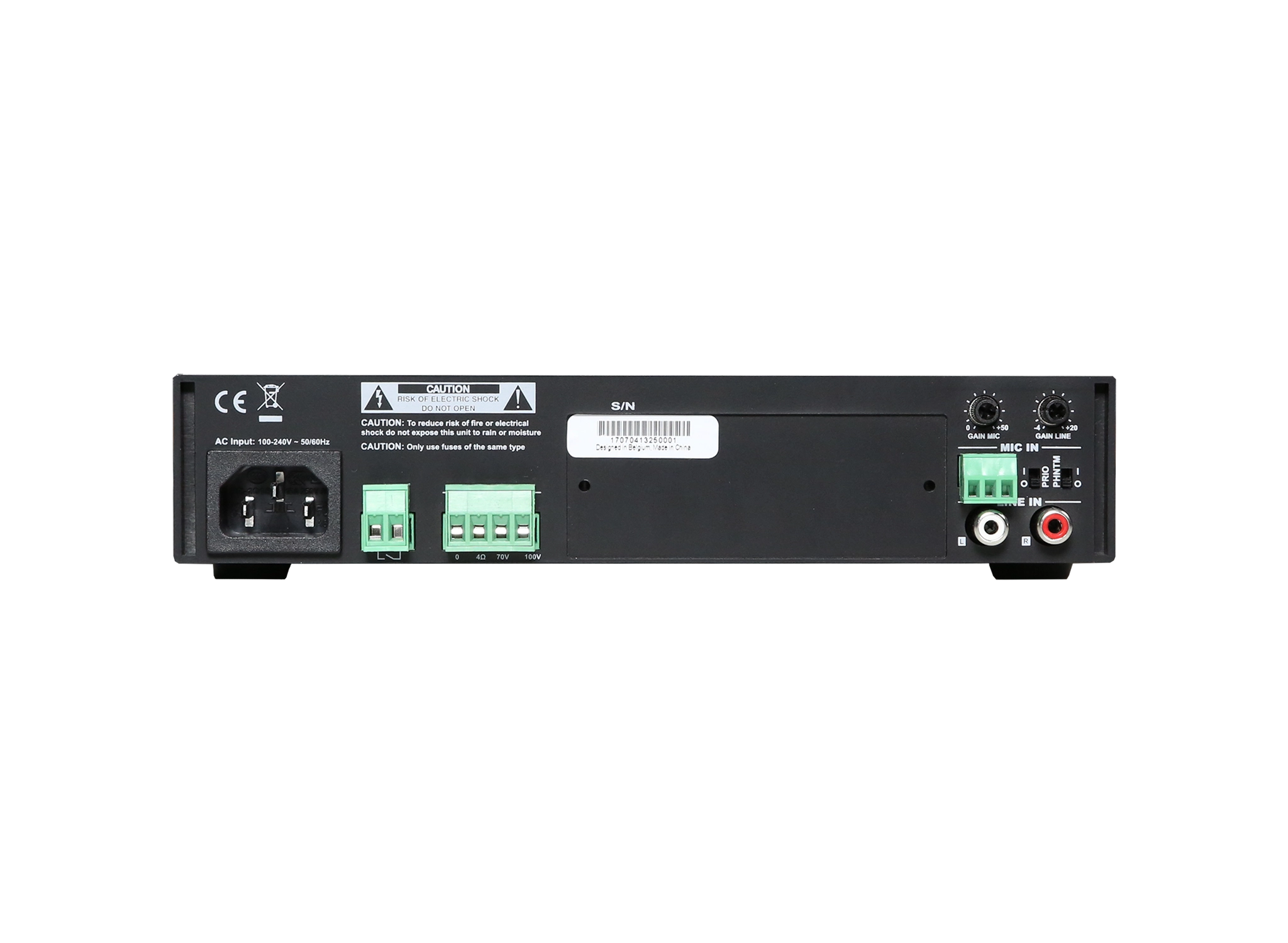 A stereo line input allows connection for a wide variation of audio sources such as media players, radio tuners, internet audio players, … and many more. A balanced mic / line input allows connection for an announcement microphone with compatibility for condenser microphones using the integrated phantom power supply (15V). A priority switch overrides the background music when enabled, and compatibility with voice file players is guaranteed by the wide gain adjustment possibility (0 dB – +50 dB).
