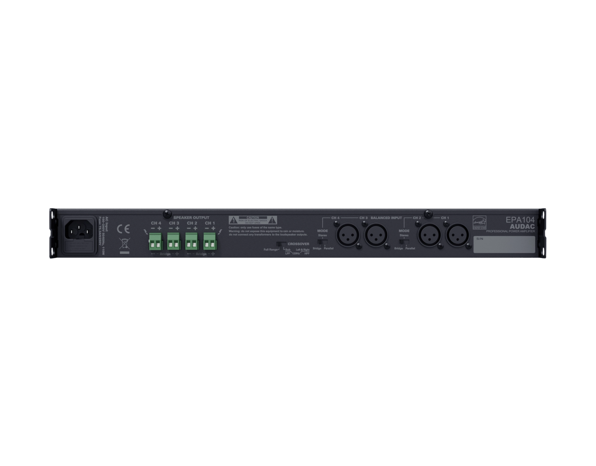 This energy efficient stereo amplifier will automatically switch to a standby mode when no audio signals are detected (less than 1Watt power consumption in standby mode). Their weight and compact size makes these single rack space amplifiers ideal for both fixed and mobile installations. Their use of Class-D technology ensures excellent efficiency as well as outstanding sound quality. Thanks to the complete passively cooled entity only a minimal of maintenance is needed, while ensuring maximum reliability. The quad channel construction consists of four channels with the possibility to use two independent stereos. In combination with the integrated active crossover network, it offers a complete solution for compact stereo applications with a bass cabinet. Various specific functions and advanced circuitry guarantees an optimal protection against DC malfunctioning, short circuit, overheating and overload. Signal input connections are integrated with balanced XLR connectors. Outputs are connected using terminal block connectors.