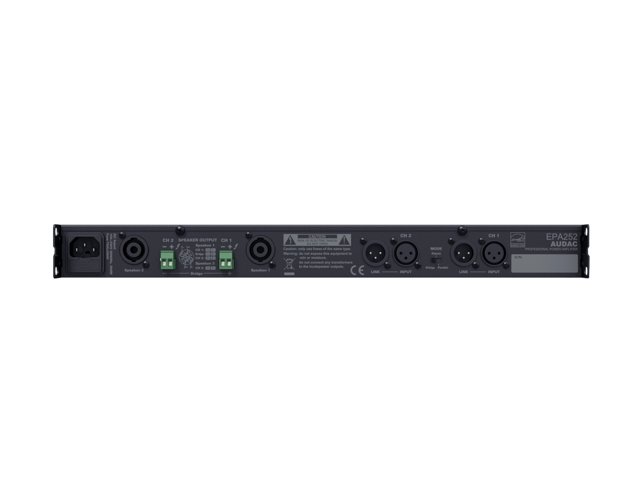 This energy efficient stereo amplifier will automatically switch to a standby mode when no audio signals are detected (less than 1Watt power consumption in standby mode). Their weight and compact size makes these single rack space amplifiers ideal for both fixed and mobile installations. Their use of Class-D technology ensures excellent efficiency as well as outstanding sound quality. Thanks to the complete passively cooled entity only a minimal of maintenance is needed, while ensuring maximum reliability. Various specific functions and advanced circuitry guarantees an optimal protection against DC malfunctioning, short circuit, overheating and overload. Signal input connections are integrated with balanced XLR connectors, and signal link through is possible using the XLR output connectors. Outputs are connected using terminal block connectors.