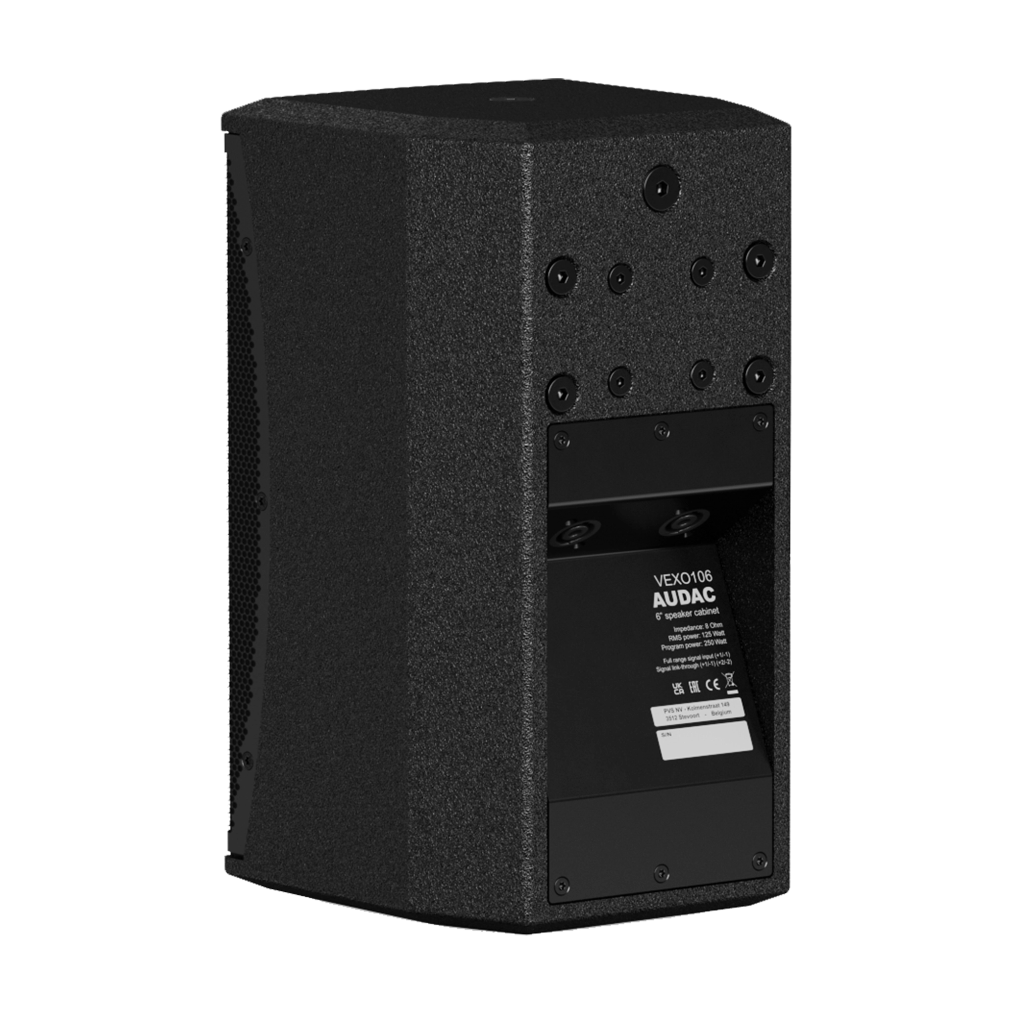 Thanks to the unique driver composition, the VEXO106 delivers a clear and natural sound with a continuous power of 125 Watts and a maximum power of 500 Watt. The frequency response (±3dB) starts from 80Hz up to 25 kHz and the sensitivity (1W/1m) reaches 92dB while a maximum continuous sound pressure level from 113dB can be achieved.